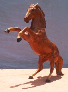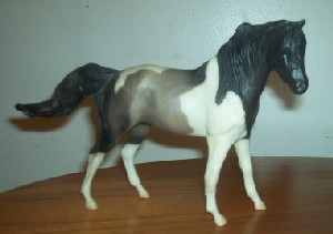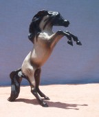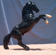 1988 black Spanish Mustang stallion. Midnight Wind is a gleaming blue-black, gaited stallion with elegant carriage, & a willingness to do anything asked of him. He combines 2 gaited lines, so will produce gait. FFC 1992.